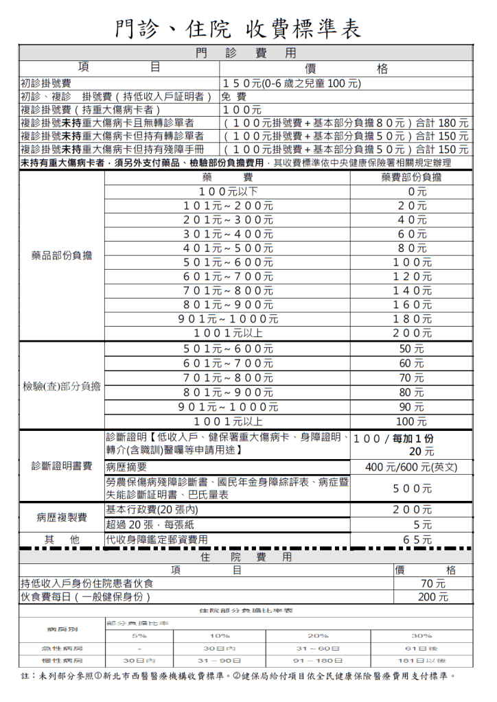 詳細門住診收費標準,請見下圖 (更新日期:2022年4月25日)