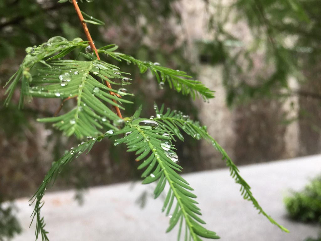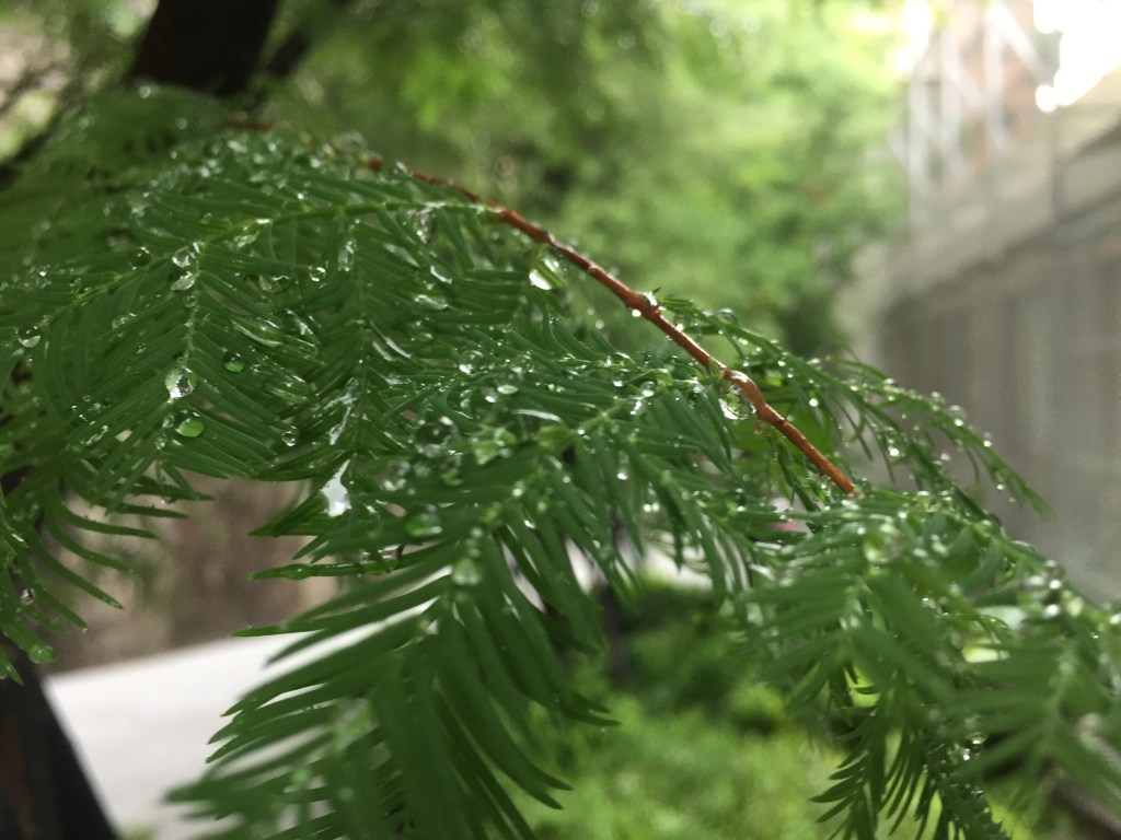 趁著雨勢稍小,一時興起拿起手機到小森林裡隨意拍攝,穿過樹下的婉轉小徑,水滴透過落羽松也落在我身上,霎時發現一顆顆晶瑩剔透的水珠停駐在落羽松的樹葉上,就像燦爛的燈飾裝扮著聖誕樹,這一顆顆水晶般的水珠與乘載他的樹葉相互輝映,格外美麗。
