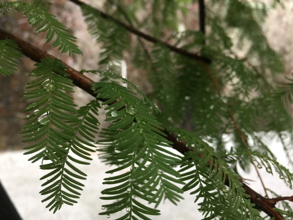 感謝這一片小森林,也感謝這從天而降的小水晶,落在這姿態優美的落羽松;這落雨在落羽松上停駐,也留下了雨水來過的痕跡。