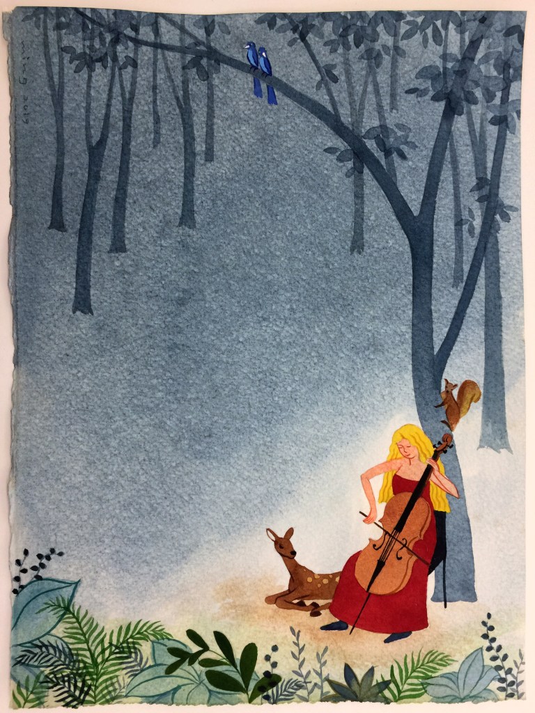 在森林裡的場景,一位女子獨自在樹下演奏著大提琴,這位女子身著紅而不艷的連身裝,從她怡然忘我的表情及輕鬆優雅的姿態,似乎我們也可以感受到那琴聲的優雅美妙。琴聲在森林裡悠悠響起,動物們也被吸引前來聆聽,透過音樂拉近了人與大自然的距離,美妙的旋律也化解了人與動物之間的籓籬。我想,音樂不單單只是音樂,透過音樂可以連結至大自然,包含動物、植物,都可在音樂的旋律中得到慰藉及療癒…‥甚至空氣裡的水分子。