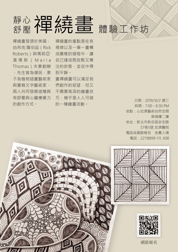 靜心舒壓禪繞畫 體驗工作坊 心理師 活動資訊 禪繞畫發源於美國,由芮克˙羅伯茲(Rick Roberts)與瑪莉亞˙湯瑪斯(Maria Thomas)夫妻創辦,先生曾為僧侶,妻子為植物插畫藝術家與書寫文字藝術家,兩人共同發展這種具有舒壓與心靈療癒力的創作方式。禪繞畫的重點是在有規律以及一筆一畫構成圖樣的過程中,讓自己達成既放鬆又專注的狀態,並從中得到平靜。 畫禪繞畫可以滿足我們創作的慾望,但又不需要高深的繪畫技巧,幾乎是人人可做的一種繪畫活動。適合參加的對象:一般社區民眾、有紓壓或靜心需求的民眾人數限制:30人 網路報名 相關