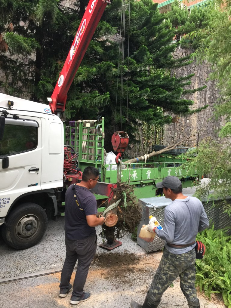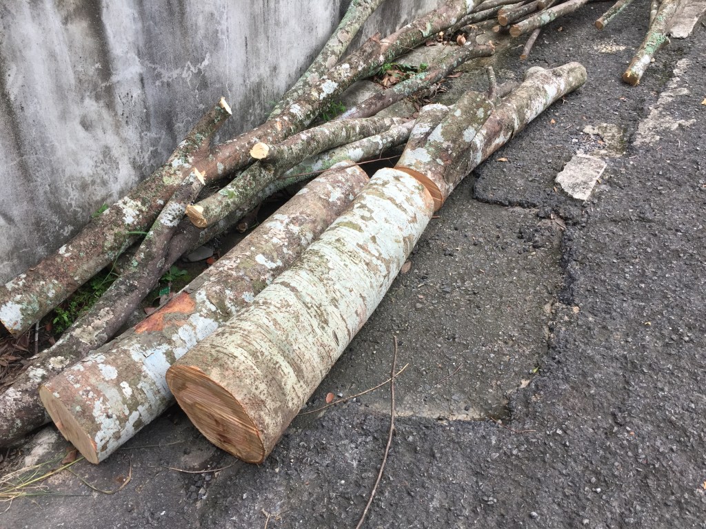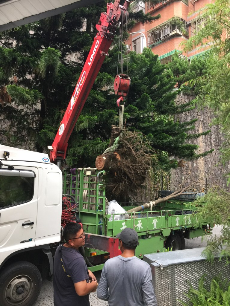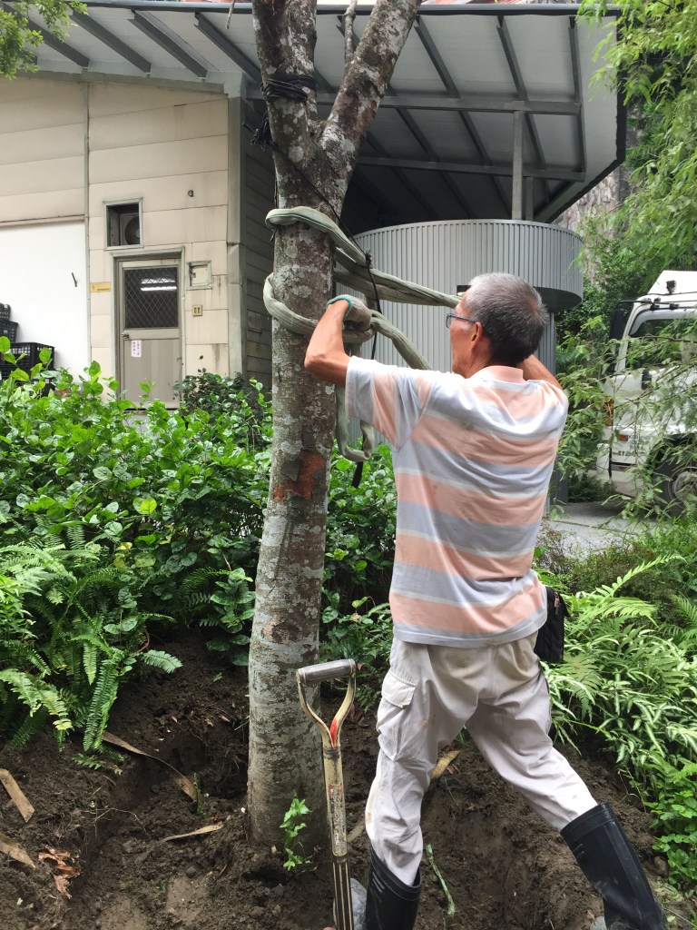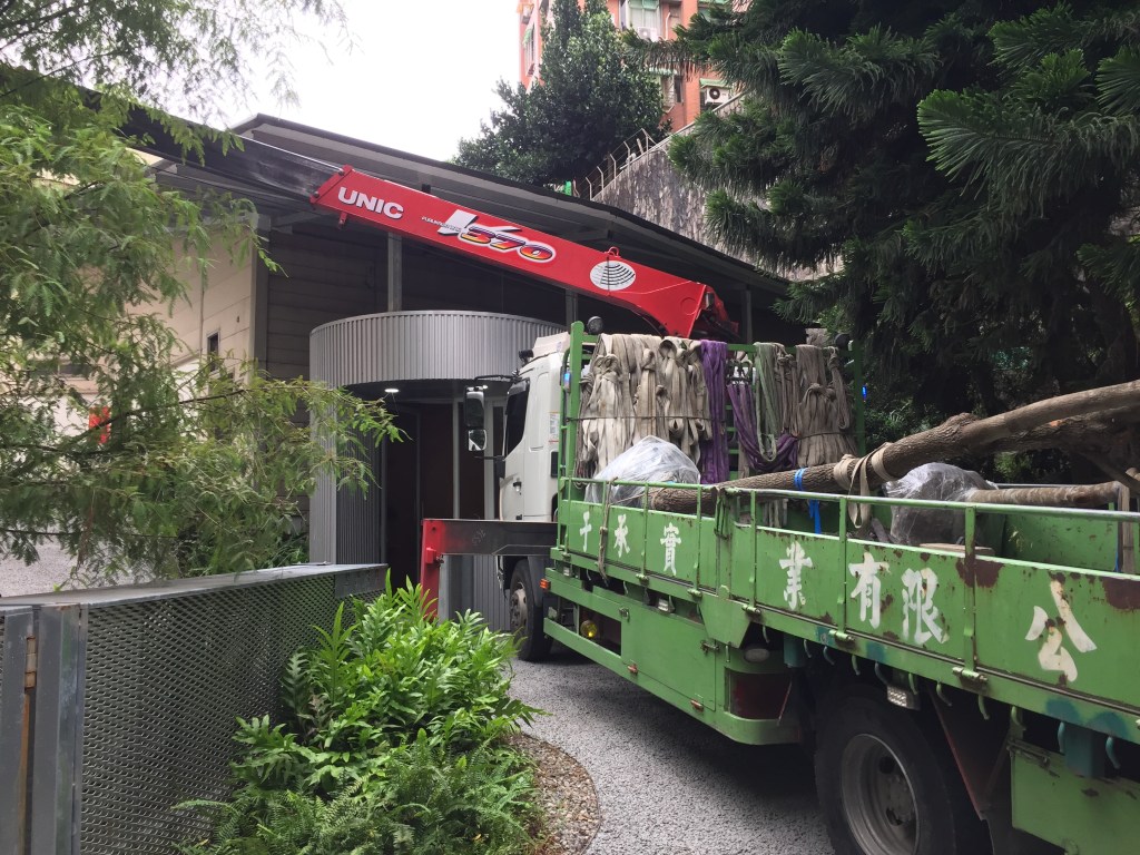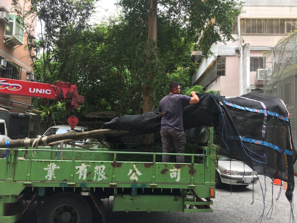 換樹的日子來了,一早大卡車就載著另一顆櫸木到來,工人在原本死掉的櫸木周遭挖土,進行更換樹木作業。卡車上的吊臂勾住綁在樹幹上的繩索,左右來回搖晃,費了一把勁才將這屹立一年多的櫸木連根拔起,並在原位種上小一號的新櫸木。死掉的櫸木除了龐大的樹根部分,其他樹幹我則請工人將它鋸為一段一段,置於一旁,看能否再做利用。