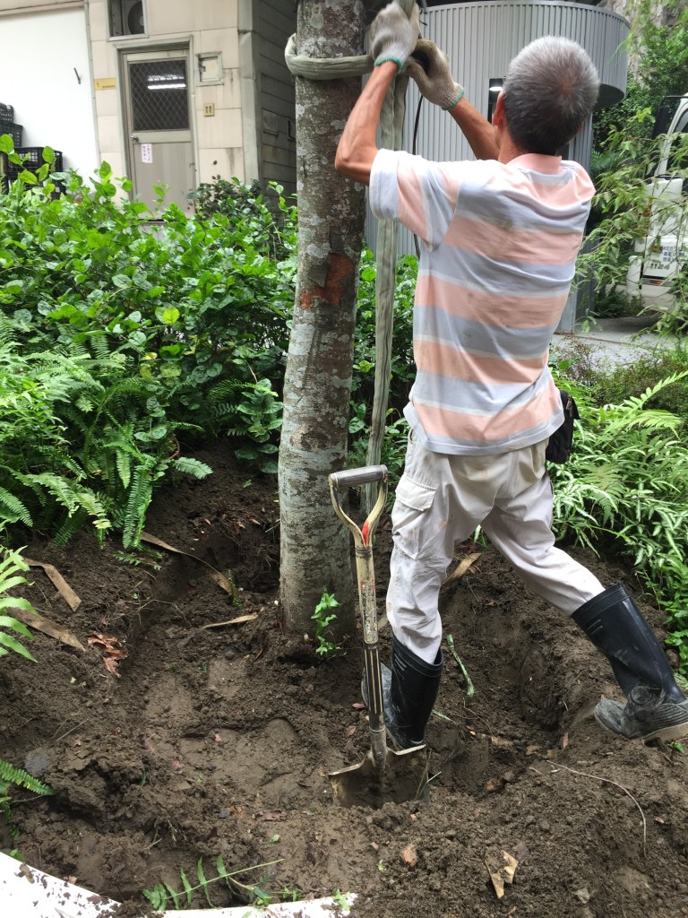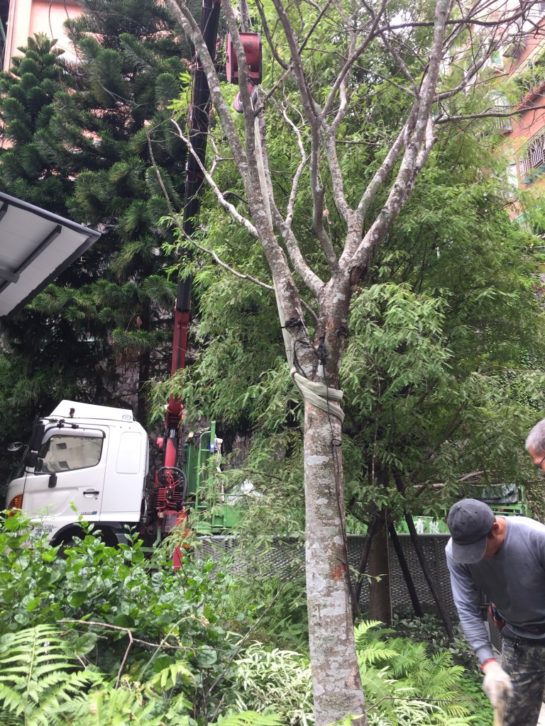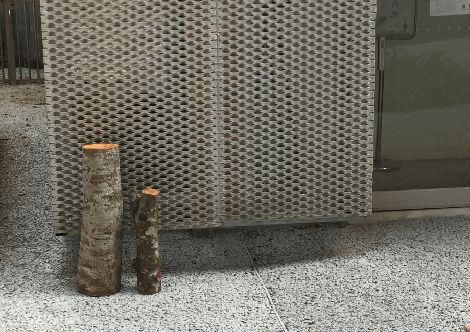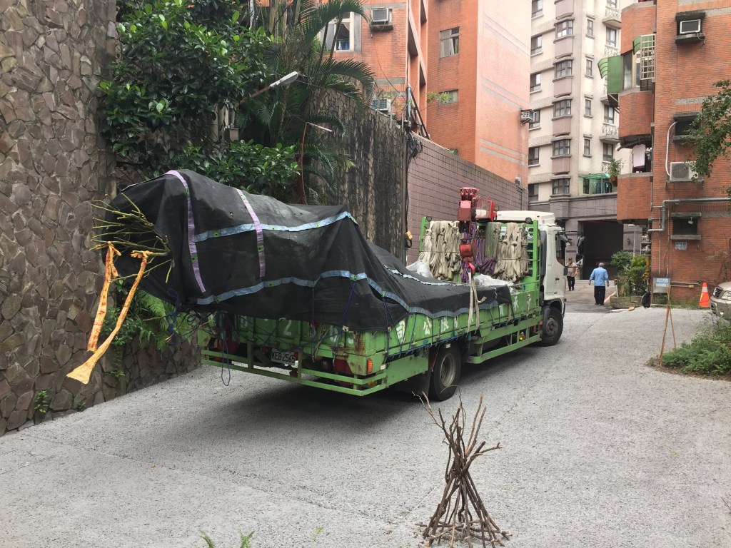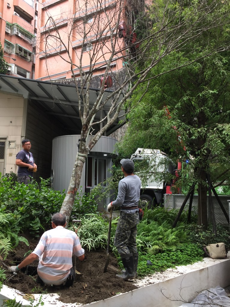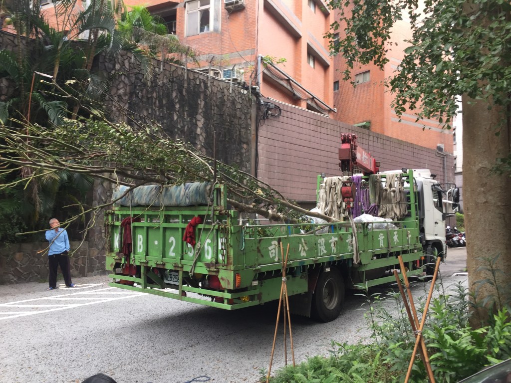 換樹的日子來了,一早大卡車就載著另一顆櫸木到來,工人在原本死掉的櫸木周遭挖土,進行更換樹木作業。卡車上的吊臂勾住綁在樹幹上的繩索,左右來回搖晃,費了一把勁才將這屹立一年多的櫸木連根拔起,並在原位種上小一號的新櫸木。死掉的櫸木除了龐大的樹根部分,其他樹幹我則請工人將它鋸為一段一段,置於一旁,看能否再做利用。