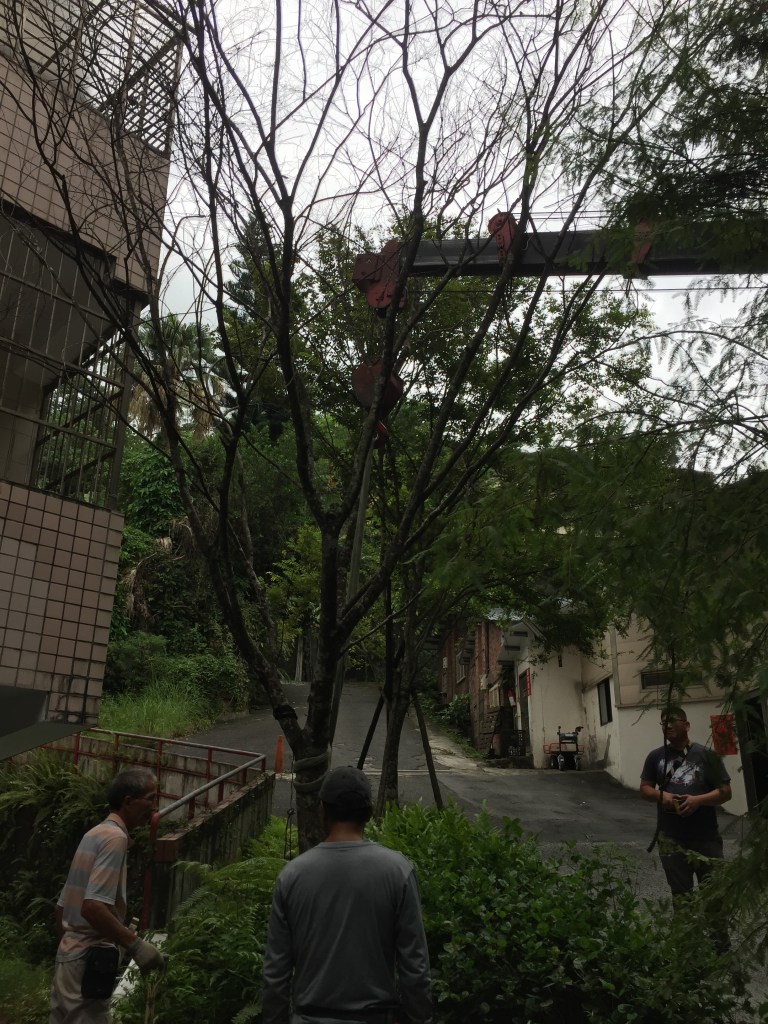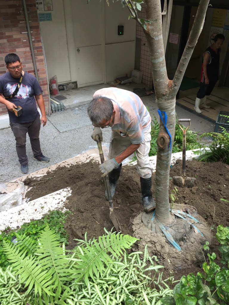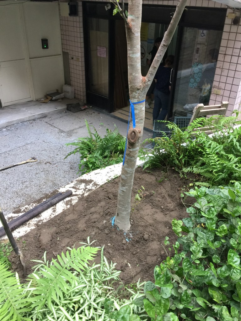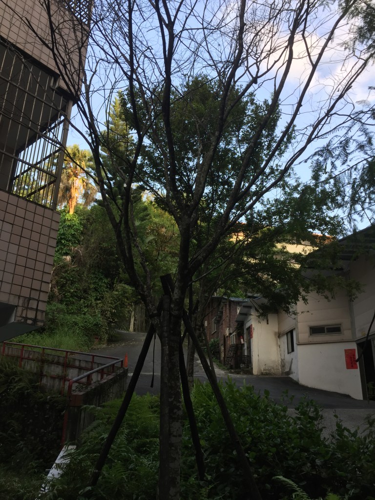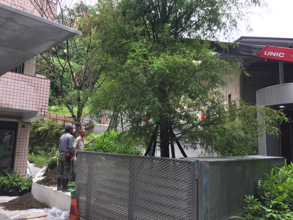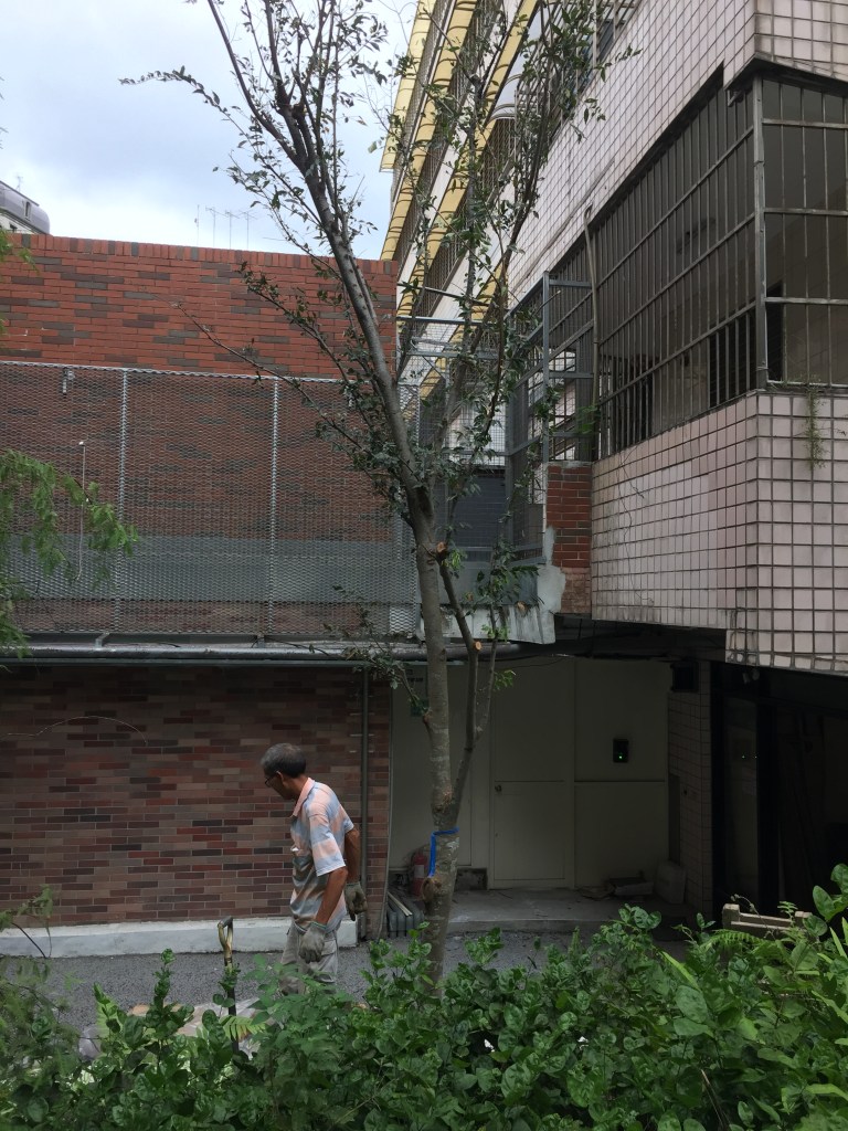 108年夏季,後棟林靜樓的部分病房工程開始動工,工務車頻繁的出入林靜樓的入口,病房裡不時地傳來刺耳吵雜的巨大聲響,周遭靠近道路的植栽也遭到無情的輾壓。大約是在工程快結束之時,位於林靜樓門口旁的植栽區,其中一棵最靠近入口通道的台灣櫸木快速地凋零,原本茂密的綠葉在短期間全部化為枯黃的葉子;又適逢颱風入境,強風一掃…,只剩下光禿禿的樹枝。我趕緊將照片傳給了小戴,他來看過之後也判斷不出枯黃的原因,直覺地認為不樂觀,應該無法存活。