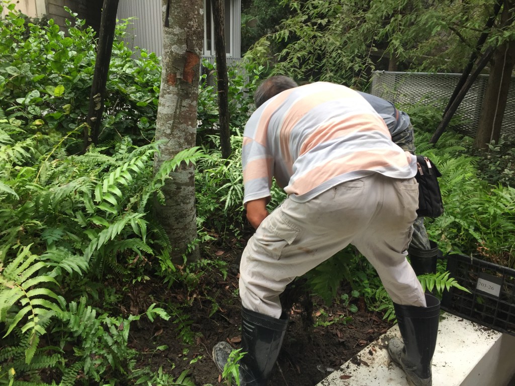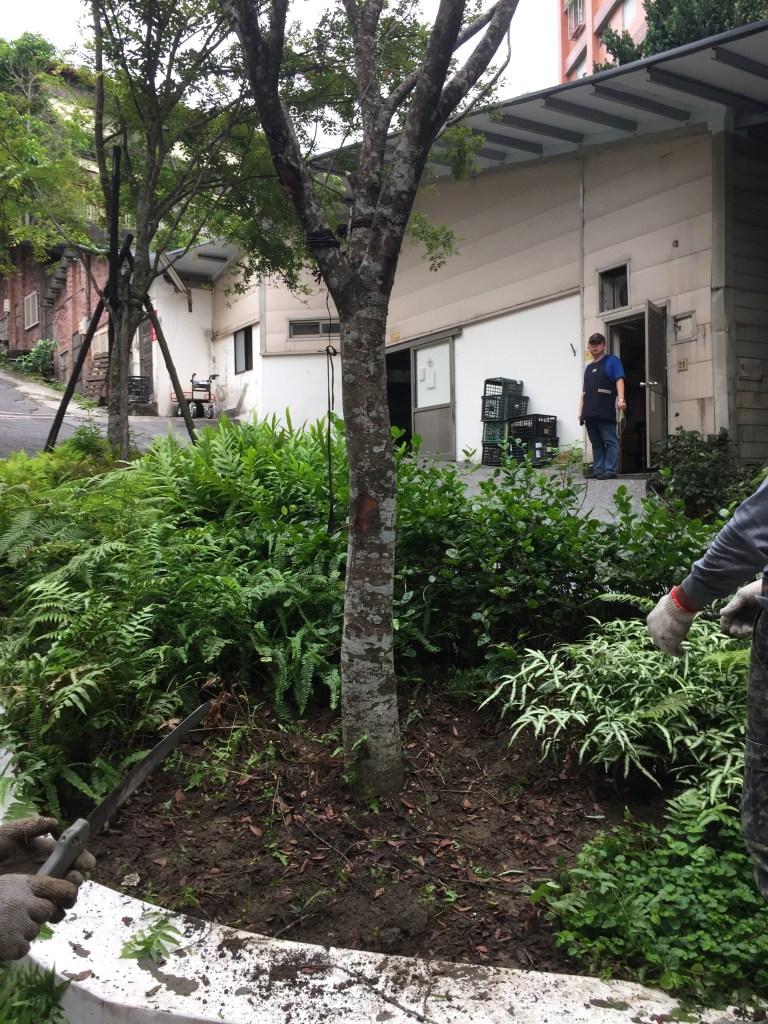 在這植栽區,規劃種植了各種不同植物,包含了許多種台灣原生蕨類,及特地從南台灣移植過來的七棵落羽松和六棵台灣櫸木,再加上原來就有的一棵小葉欖仁及五棵南洋杉,這樣總共就有了19棵高聳的樹木,徹底改變了原來缺乏綠意的院外空間。從遠處觀看感覺綠意盎然,透過院內窗戶往外看,視線先是接觸到樹木再穿越到樹外的景觀,這感覺有點像是森林裡的小木屋。