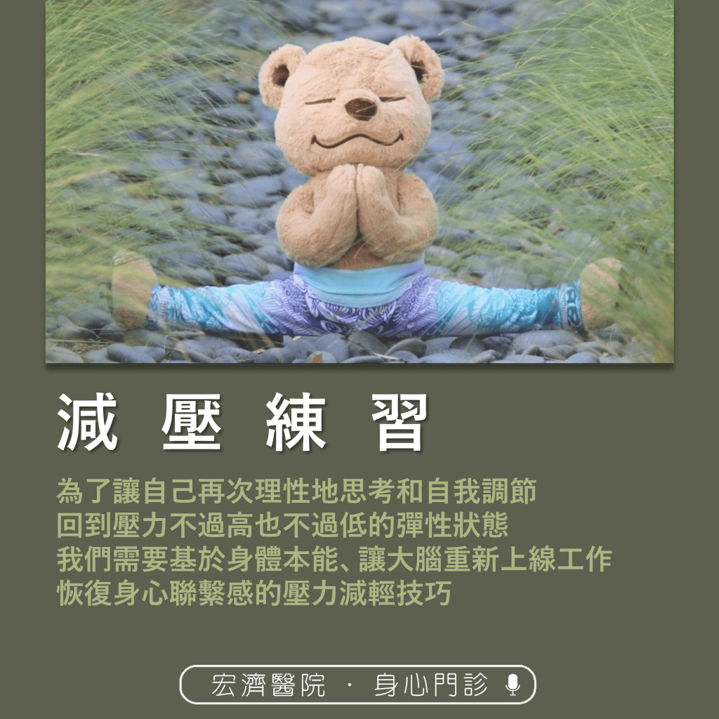 (3)移動身體:由於壓力反應會讓人想要行動(戰/逃),所以我們可順應本能,移動身體來釋放這些肌肉裡頭的張力,如去深深感受伸展手臂或推一面牆的感覺。