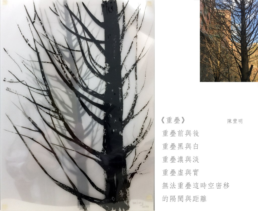 遠處灰白的樹形,交疊於近處的空隙中,有著充滿詩意的想像空間。