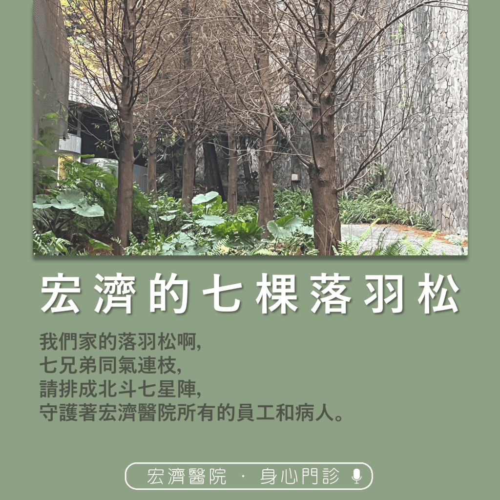 接下來,我要有心理準備:我們家的落羽松,會有其獨特的樣貌,不會是任何想像中的美景。我們家的落羽松,我覺得每年最美的是冬天的枯枝,葉子不會有太多顏色。我們家的落羽松,每年會製造很多羽毛葉的煩擾,要一直一直掃。我們家的落羽松啊,七兄弟同氣連枝,請排成北斗七星陣,守護著宏濟醫院所有的員工和病人。我們家的落羽松啊,等你們四年後成形、等你們十年後蛻變,等你們一直吸取日月精華後直聳雲霄,而我,則可安心地睡於你們所紮根的大地。