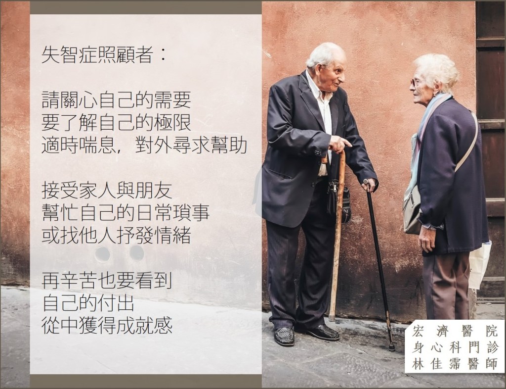因此,為了能夠持續維持高品質的照護,以下自國際老年精神醫學會對失智症照顧者之建議,簡單整理重點供大家參考,包括──